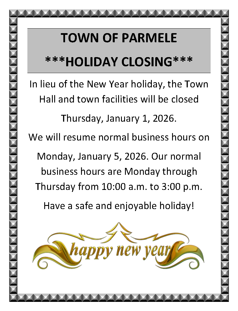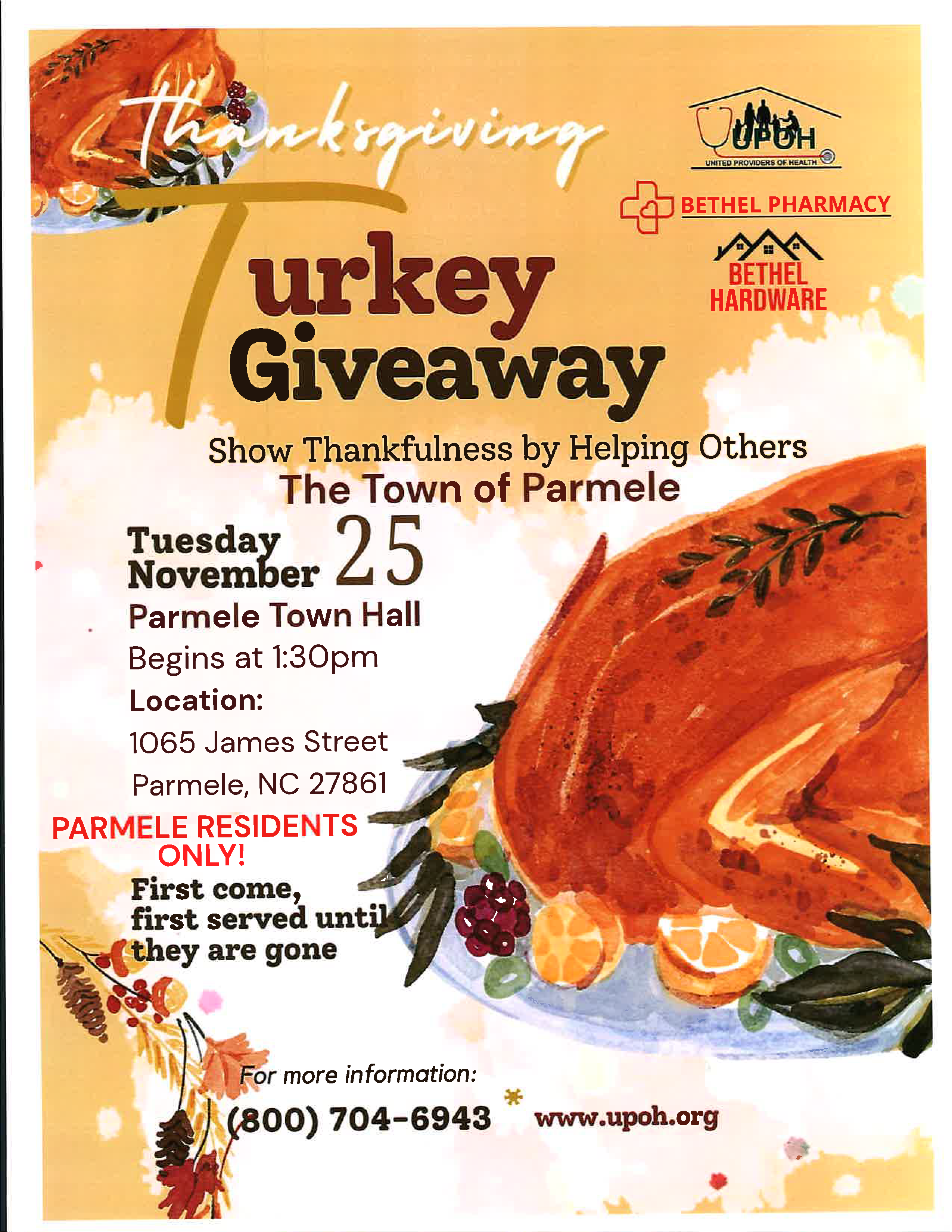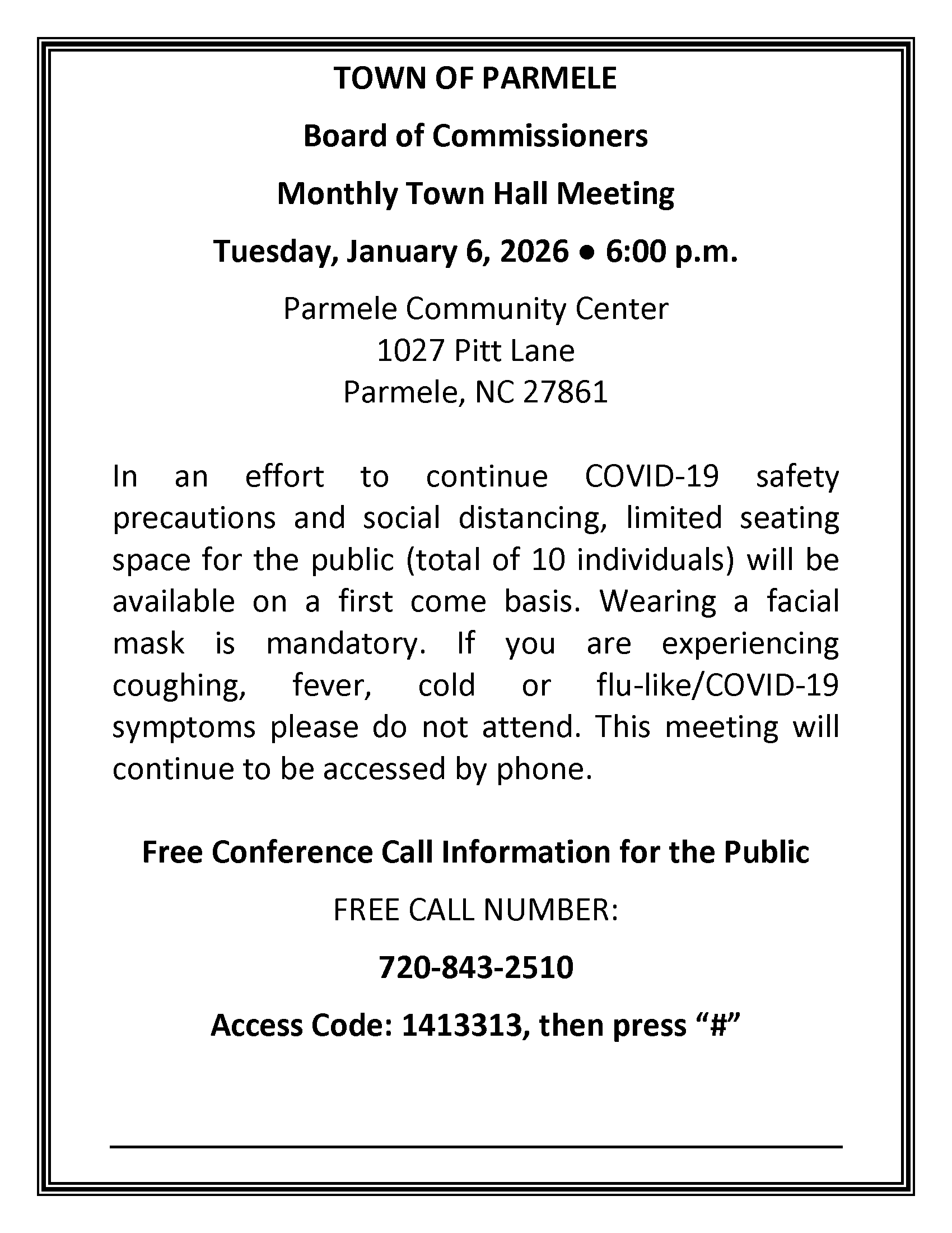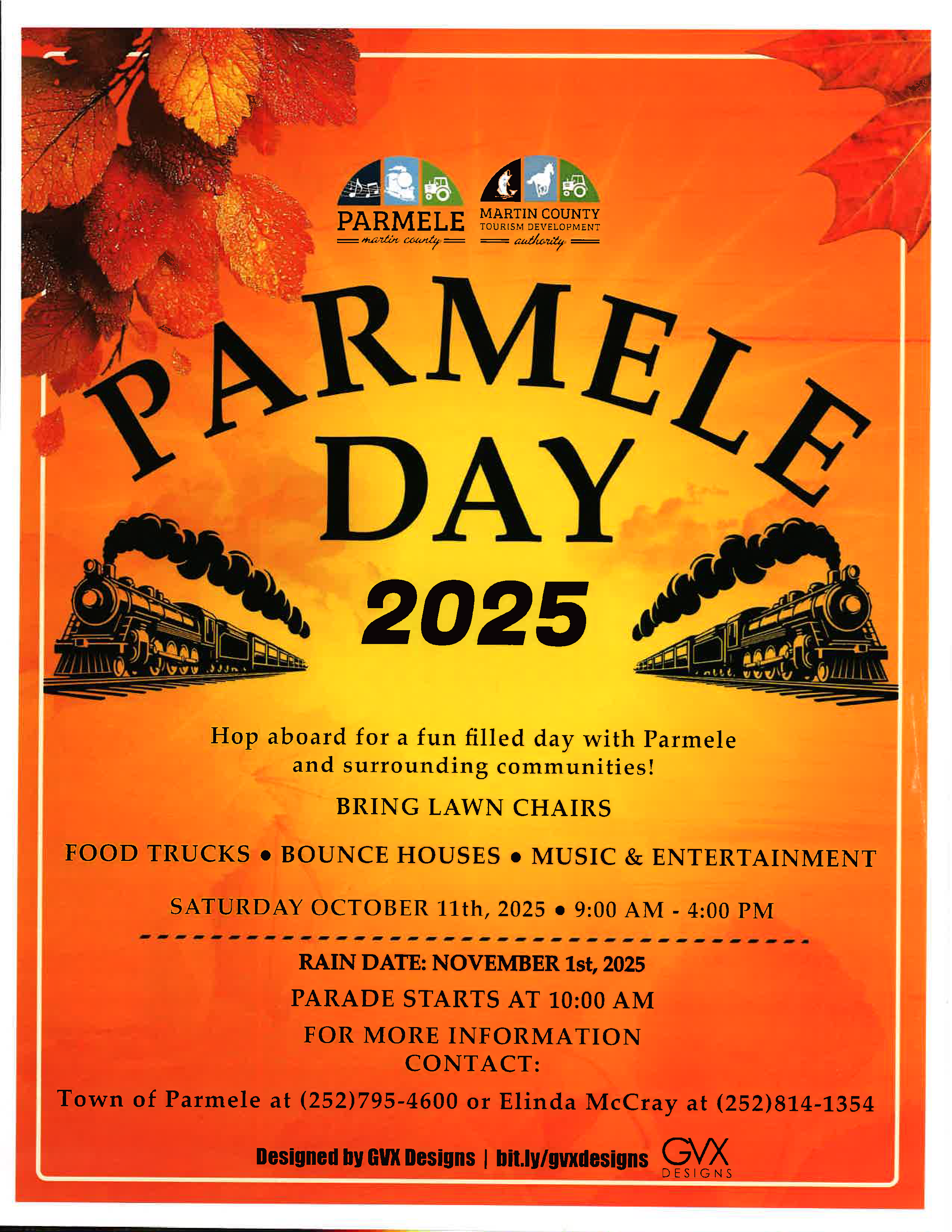 We welcome you to the Town of Parmele, located in western Martin County, North Carolina. Established in 1893, our motto is "The Small Town That Makes a Difference!" Home of the famous country music group "Parmalee", our quaint little town with a population of around 300 is a hidden gem with a rich history.