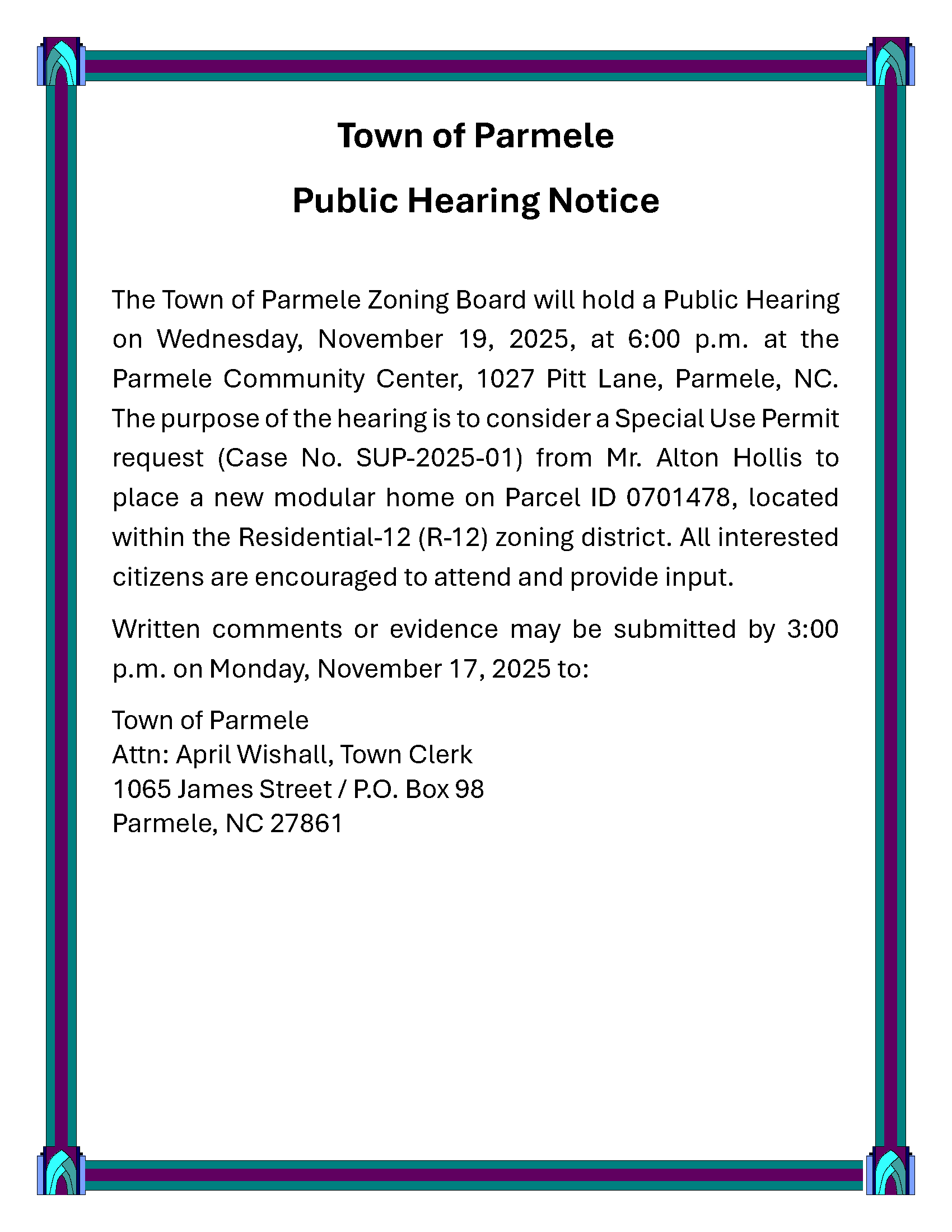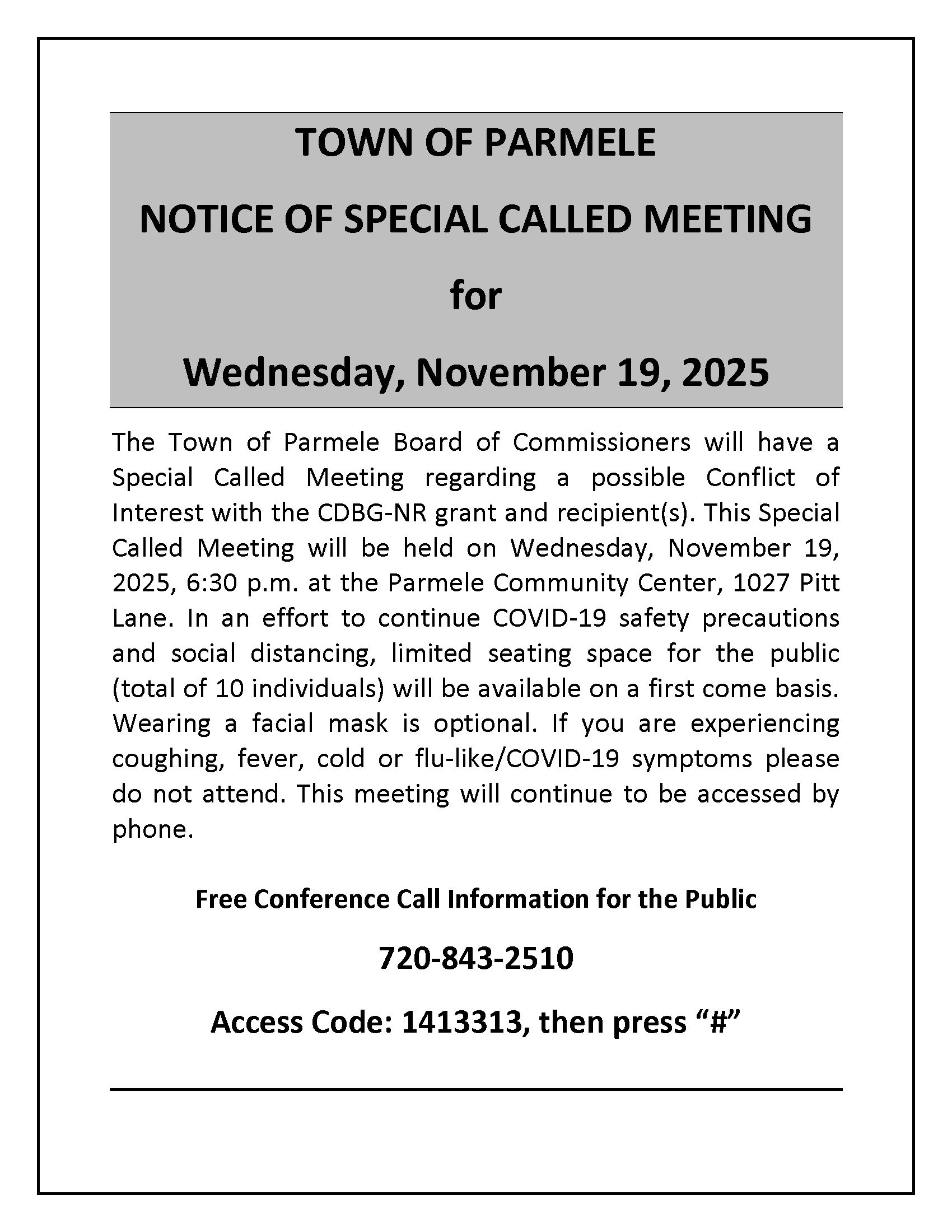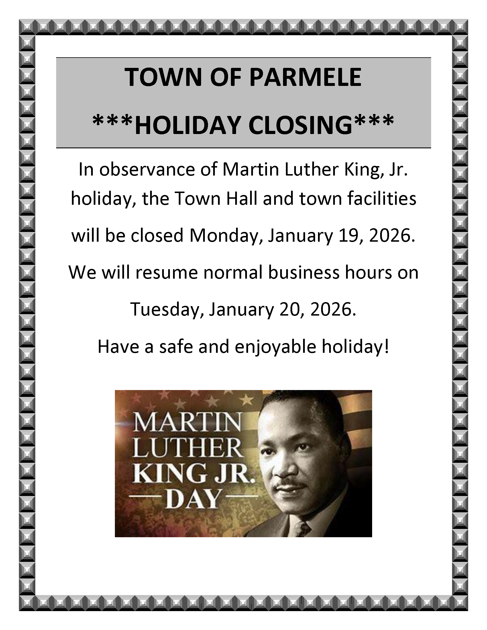 We welcome you to the Town of Parmele, located in western Martin County, North Carolina. Established in 1893, our motto is "The Small Town That Makes a Difference!" Home of the famous country music group "Parmalee", our quaint little town with a population of around 300 is a hidden gem with a rich history.