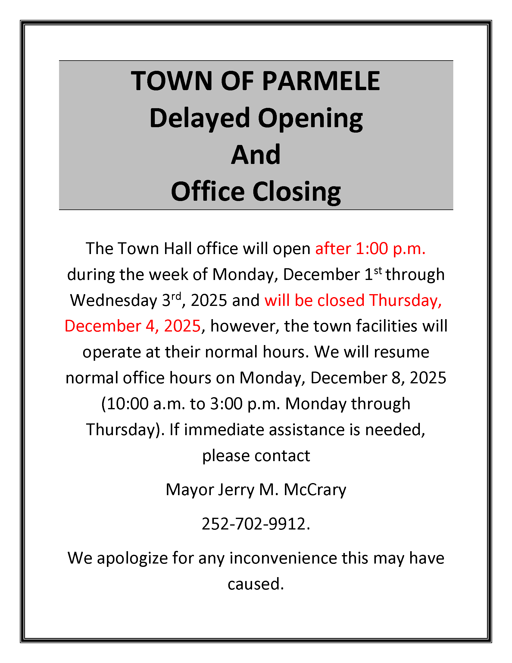 For after hours emergencies, please contact Mayor Jerry McCrary at (252) 702-9912.